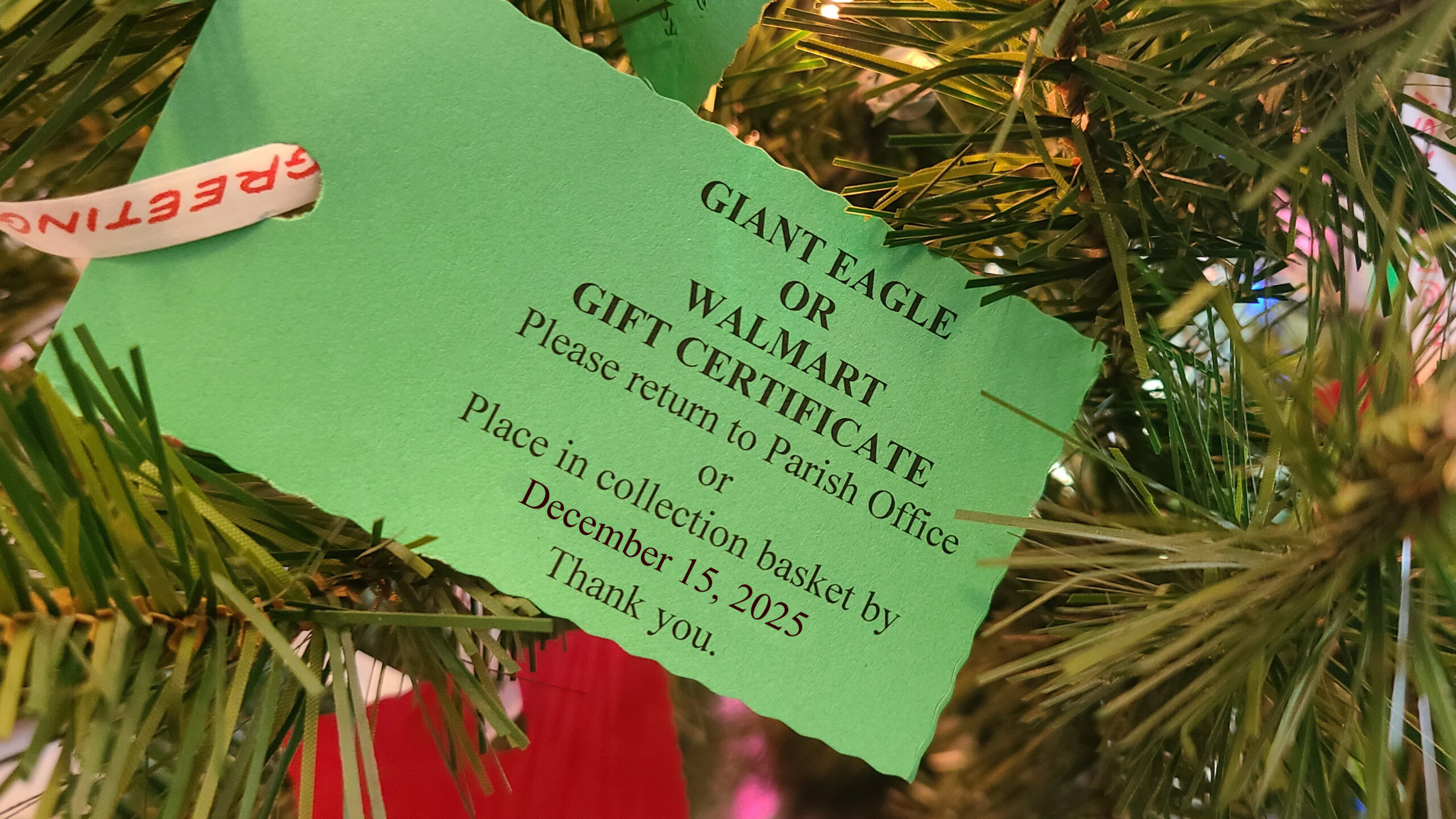 Our tree is now displayed in the narthex. Upon our humble tree are tags that you may select to purchase Giant Eagle, Walmart and Target gift cards in a variety of denominations.